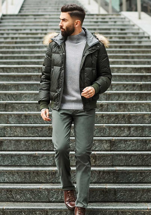 The life of the city dweller calls for functional outerwear. A gray ribbed turtleneck layers easily beneath an intriguing forest green bomber jacket.