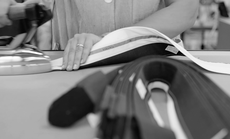 Front and back are sewn together as the plot develops, thickens and settles, the conclusion taking shape from a particular pressing technique that defines the final silhouette. A sequence of checks to ensure the finished product does the process justice, all watched over by expert eyes, before the watcher becomes the watched.